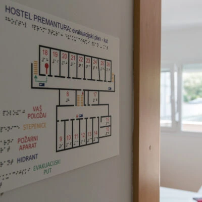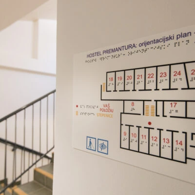 Unutar zgrade, na podu, zidovima i staklenim zidovima nalaze se taktilne površine, smjernice i oznake za slijepe i slabovidne, što omogućuje bolju orijentaciju i neovisno kretanje. Taktilni planovi za evakuaciju nalaze se u svakoj sobi i hodniku, a na vratima svake sobe nalaze se oznake na uvećanom crnom tisku i na Brailleevom pismu.